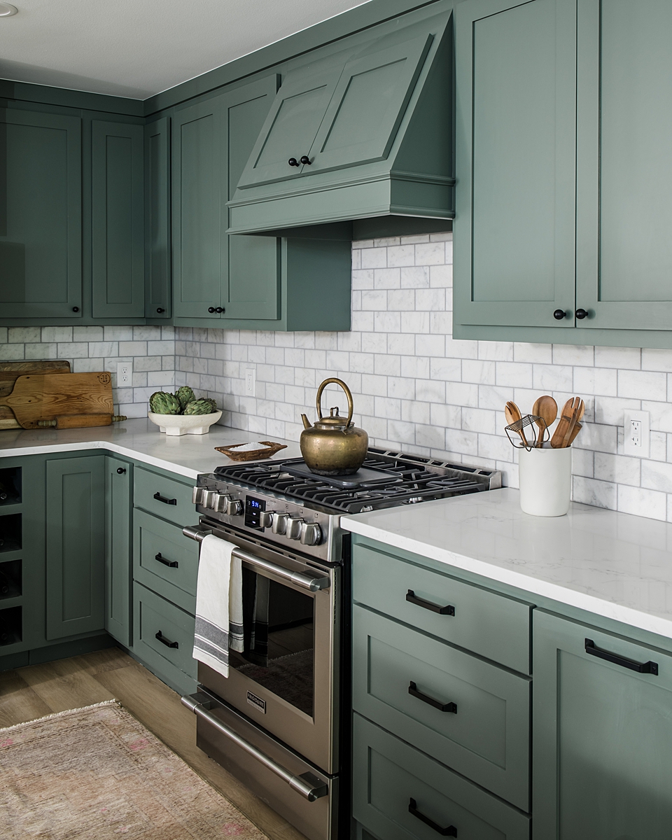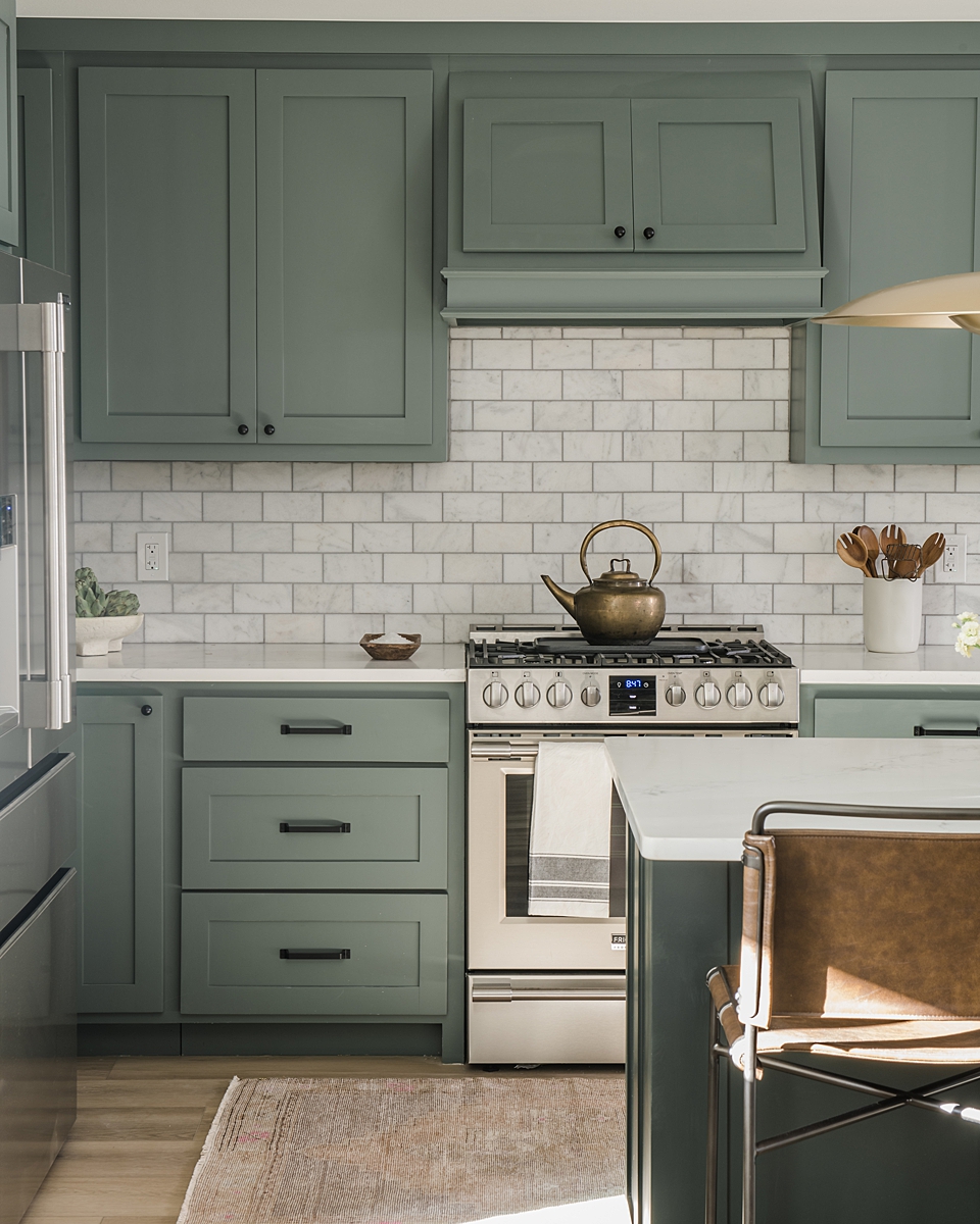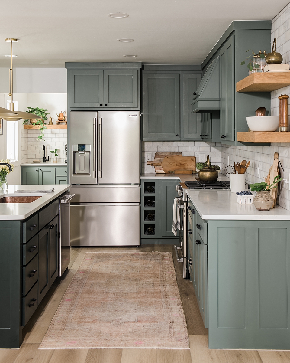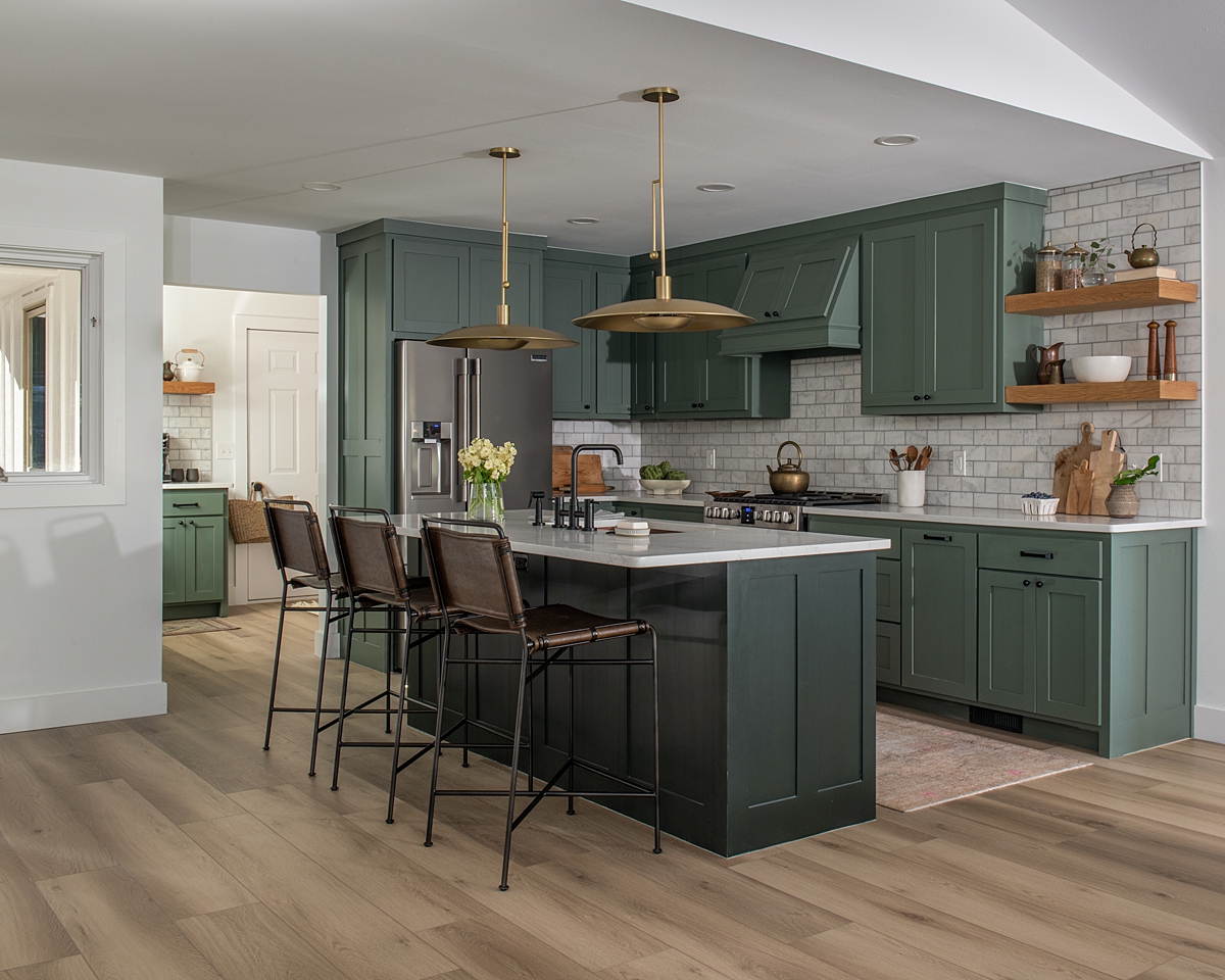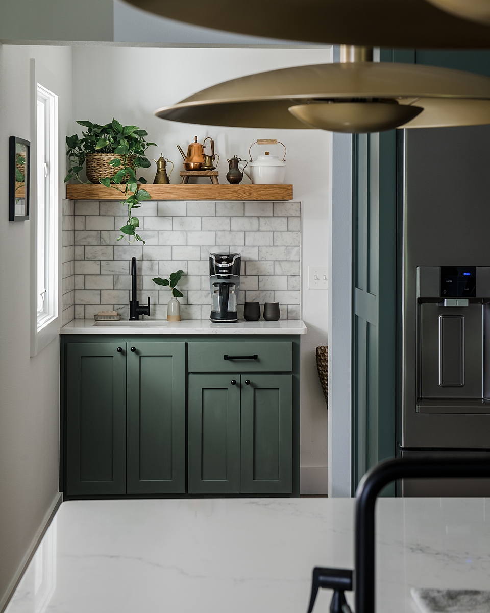 To accommodate this new layout we created, we moved a doorway to the home’s main bedroom and added cabinetry in the pantry area at the back of the kitchen. A coffee bar off the kitchen helped add to the welcoming space of the home. Since Todd and Trisha like green, we used a dark, earthy shade for their new cabinets and a light shade for their island.