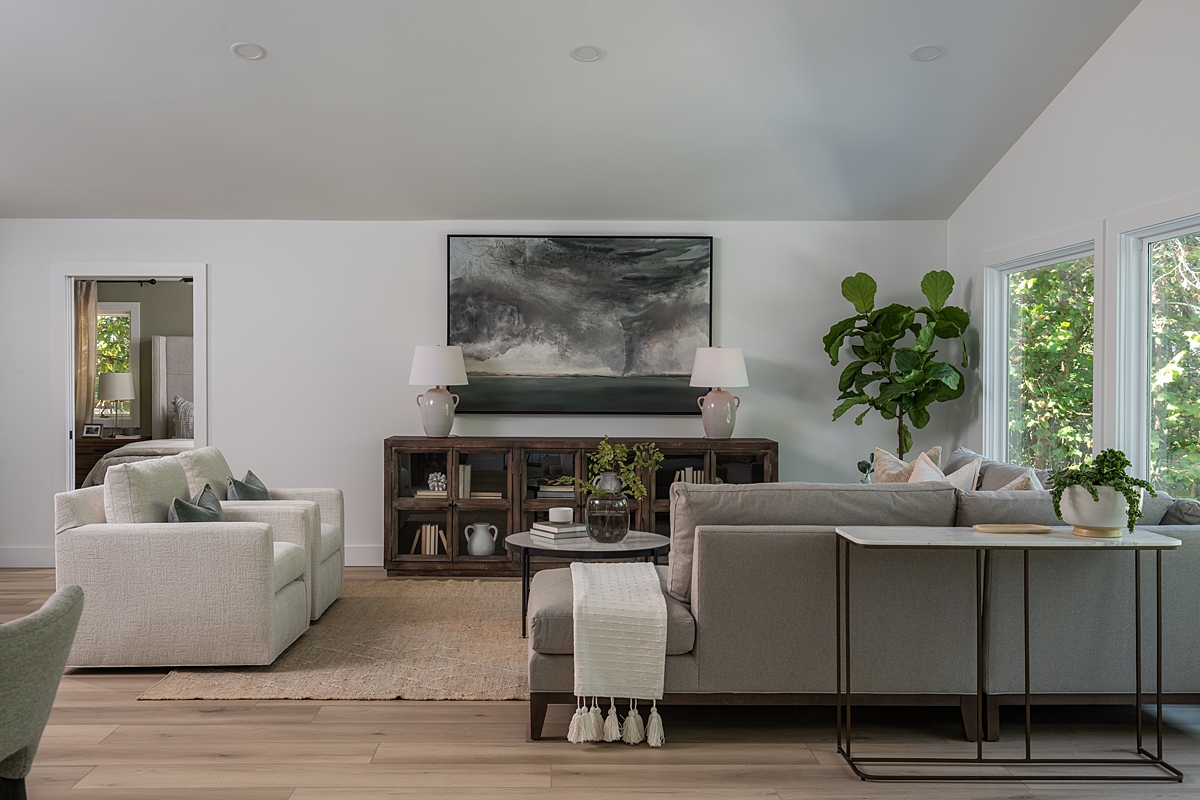 White oak floors gave this room a spacious, consistent look. The large beam from the removed wall by the kitchen pulls this space together.