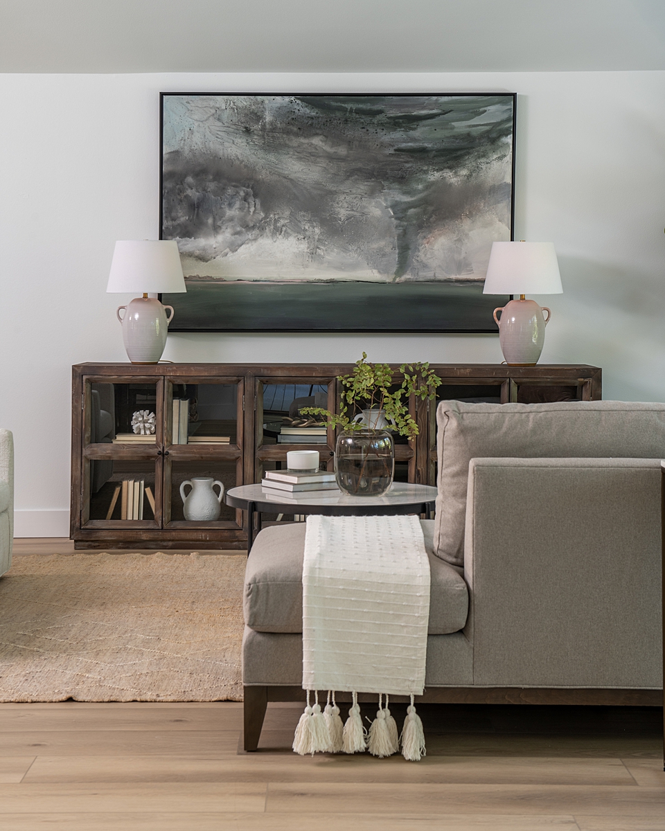 As a special surprise, I worked with local artist, Buddy Whitlock, to create a piece of art as a nod to Todd’s storm-chasing adventures. His custom tornado painting turned out to be a magnificent piece for the Lemery’s new living room.