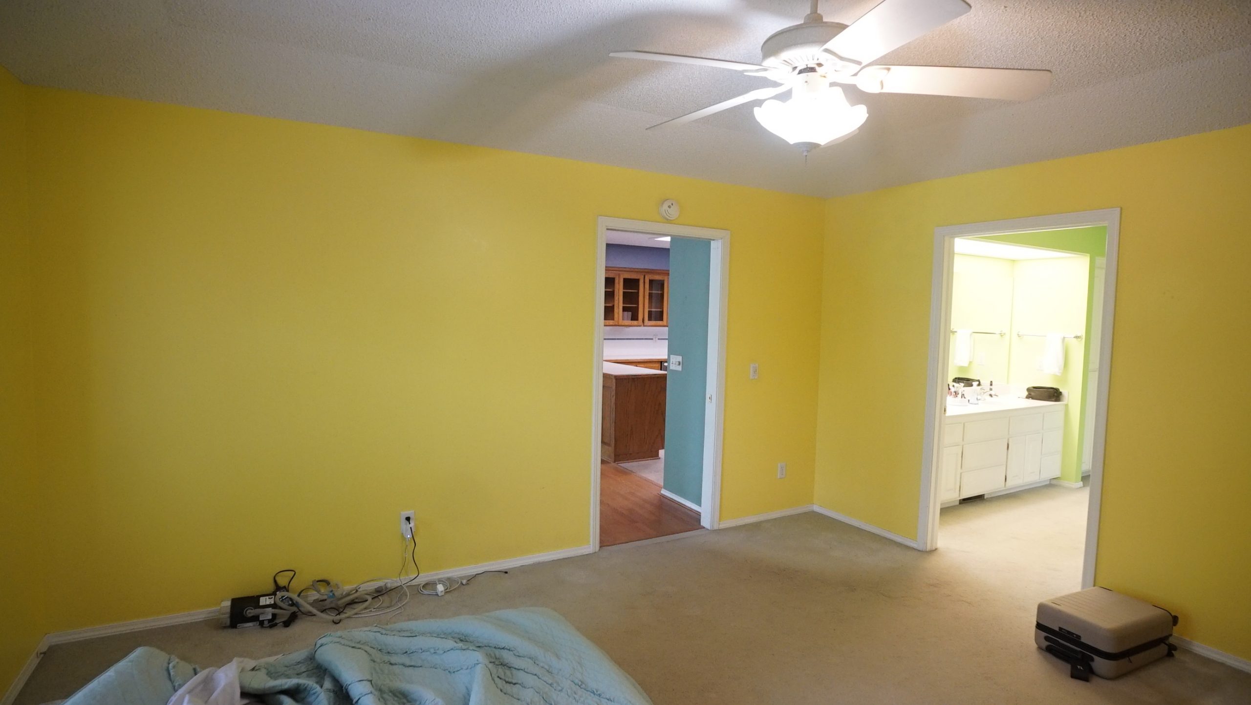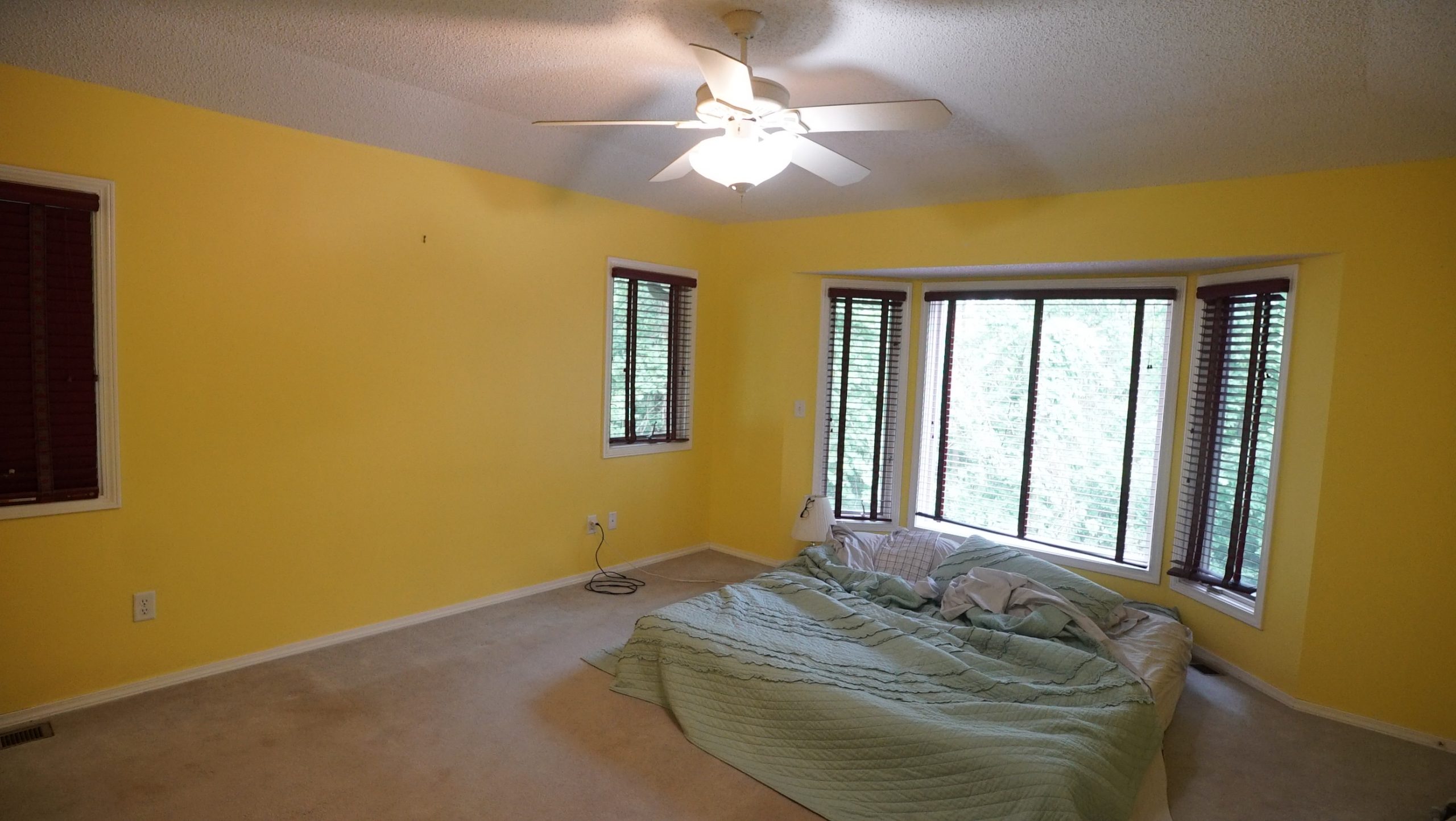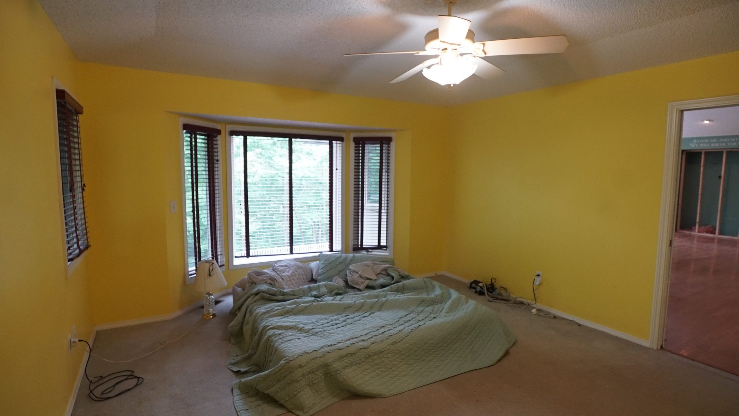 Todd and Trisha wanted a change to the tray ceiling, and of course an updated design. To help create an elegant main bedroom, we removed the old popcorn ceiling and added trim to give the illusion of a coffered design, a look that adds depth and dimension to this space. This detail plus the new flooring gave the bedroom an updated look with a little added character.